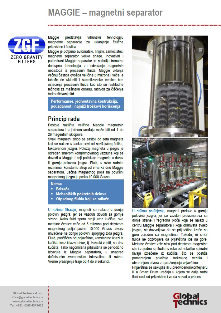Maggie je potpuno automatski, linijski, samočisteći magnetni separator, koji koristi neodijumske magnete snage peko 10.000 Gauss.